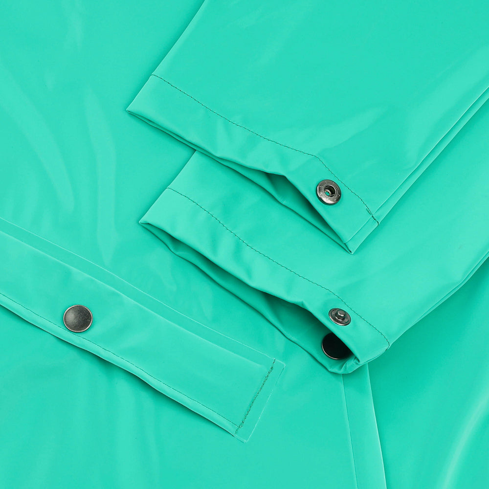 This rain jacket features a placket with snap fastenings for closure, hood with built-in cap and two side pockets with snaps. Sleeves are finished with snaps making them adjustable for a loose or tight fit.