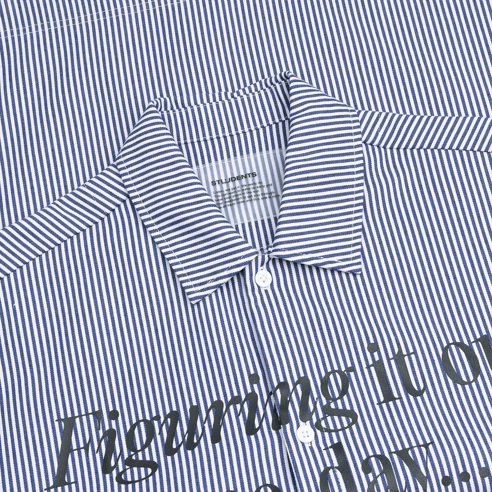 The Students Golf Reymon Stripe Oxford Button-Up Shirt is a high-quality short sleeve button-up shirt that is made out of a heavyweight striped Oxford fabric. Featuring a large screen printed "Figuring It Out One Day... At A Time" quote in Black across the front of the shirt. Crafted from durable, breathable 100% polyester, it’s finished with a classic button front and Students' signature woven label on the lower front chest.