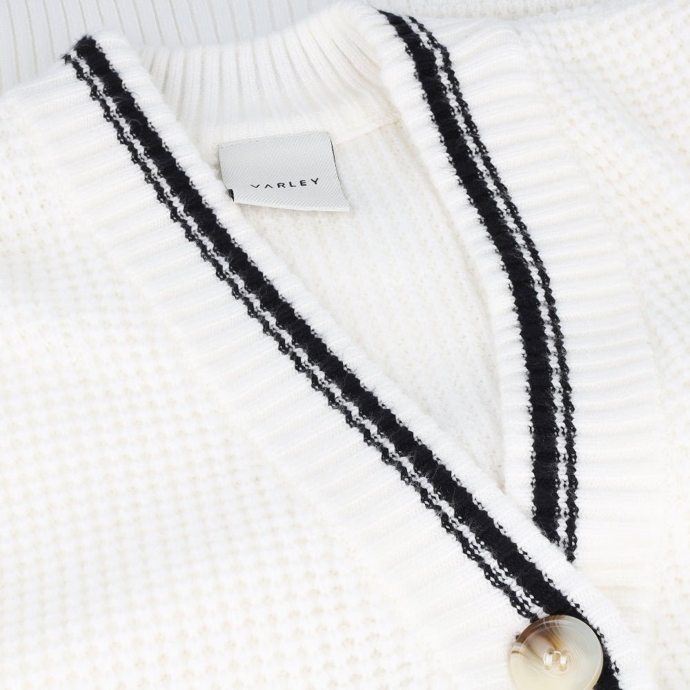 The Varley Coniston Boxy Knit Cardigan is a retro-inspired wardrobe staple crafted from ultra-soft waffle-pattern viscose yarn with bold contrast stripes. Cut in a relaxed, slightly boxy silhouette with drop shoulders and a button-front closure, it creates a laid-back, collegiate look perfect for layering over active or casual outfits. Finished with ribbed cuffs and hem, side-entry pockets, and hip-length coverage, it pairs comfort and style effortlessly in an easy-pull-on knit ideal for transitions between court, leisure, and travel.