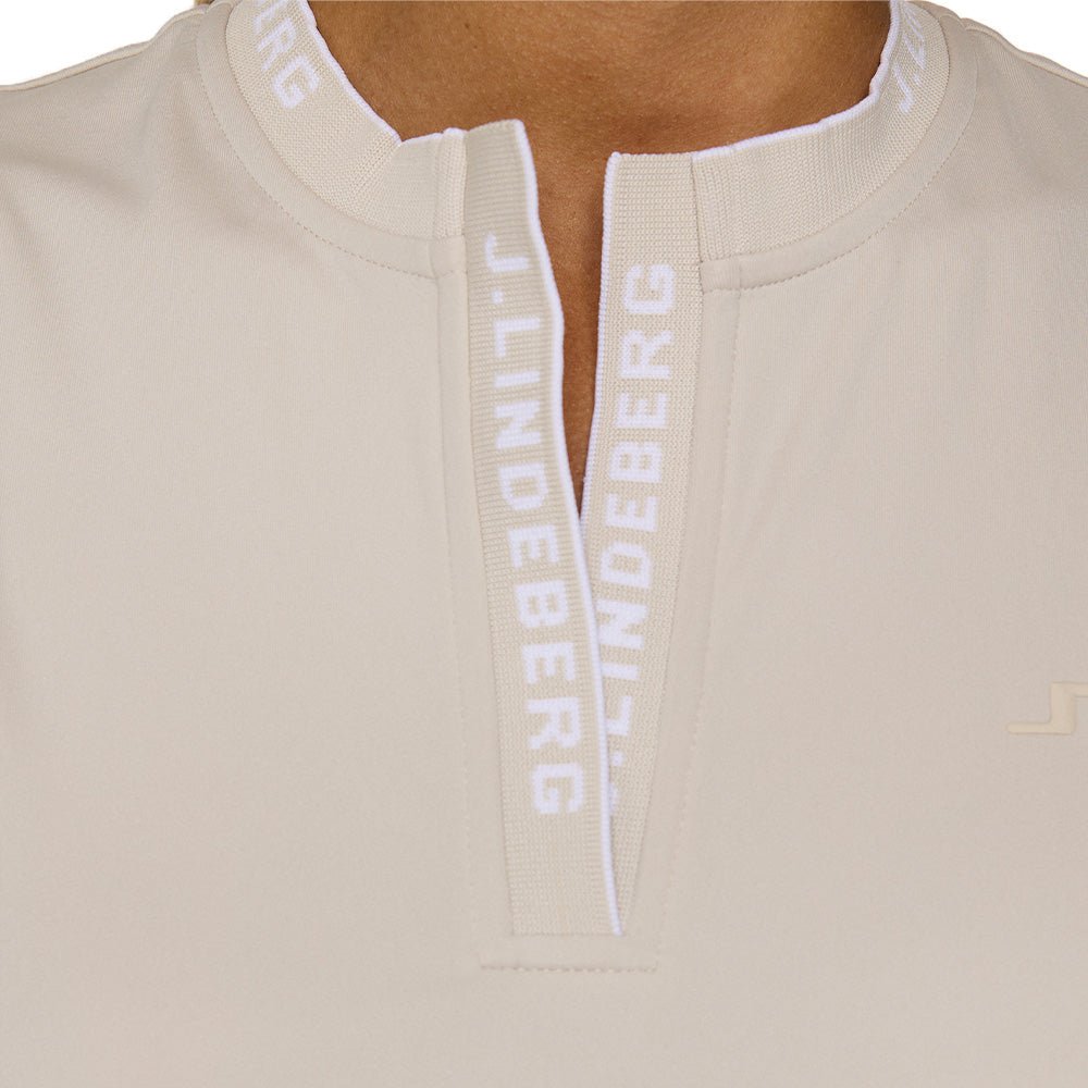 Freedom to move, style to spare. The Leya Top features a jacquard ribbed collar, contoured side panels, and technical stretch fabric. Lightweight, moisture-wicking, and ready for warm-weather play.