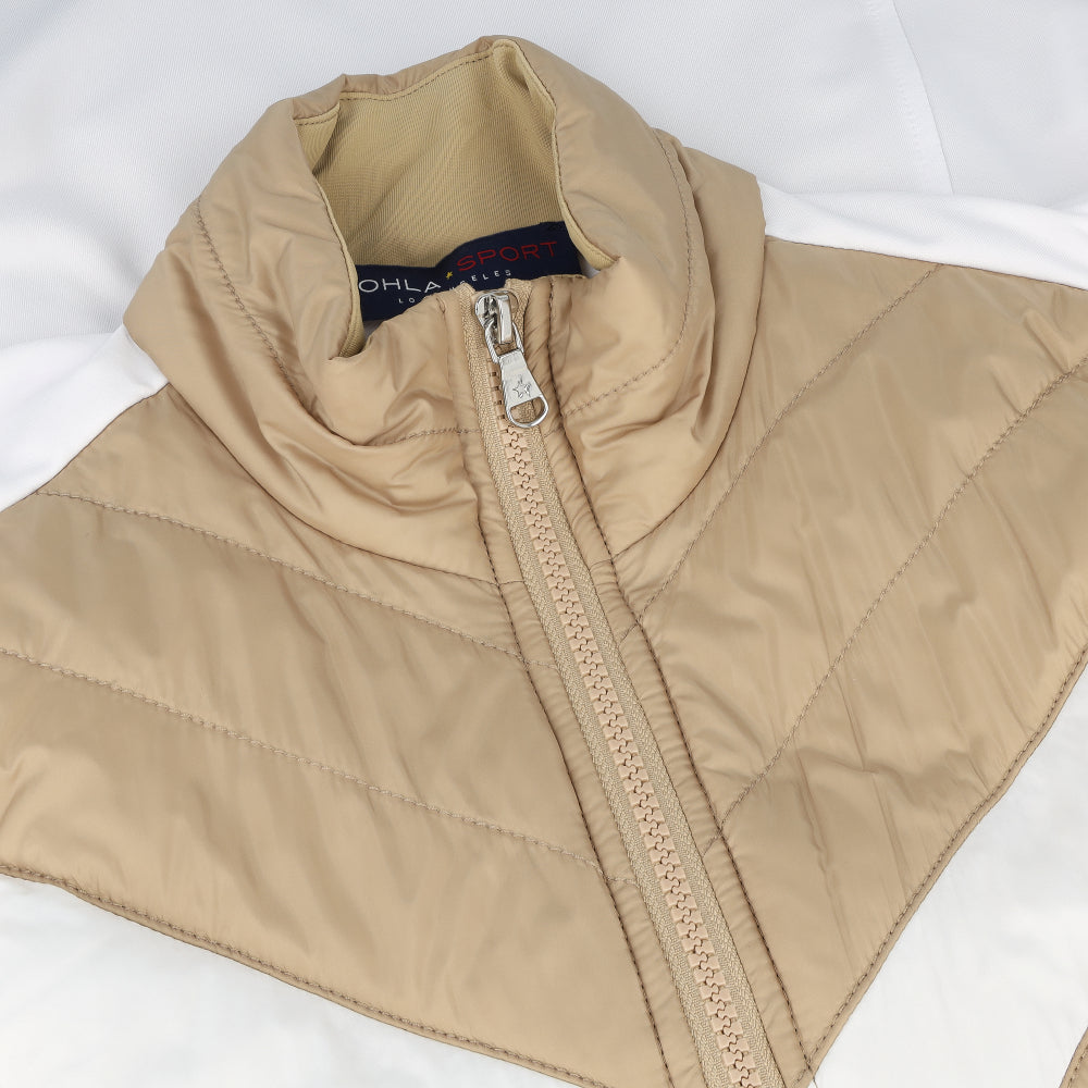 Lightly quilted and padded front paneled vest. Stretch jersey back. White chevron front placement. Full zip.
